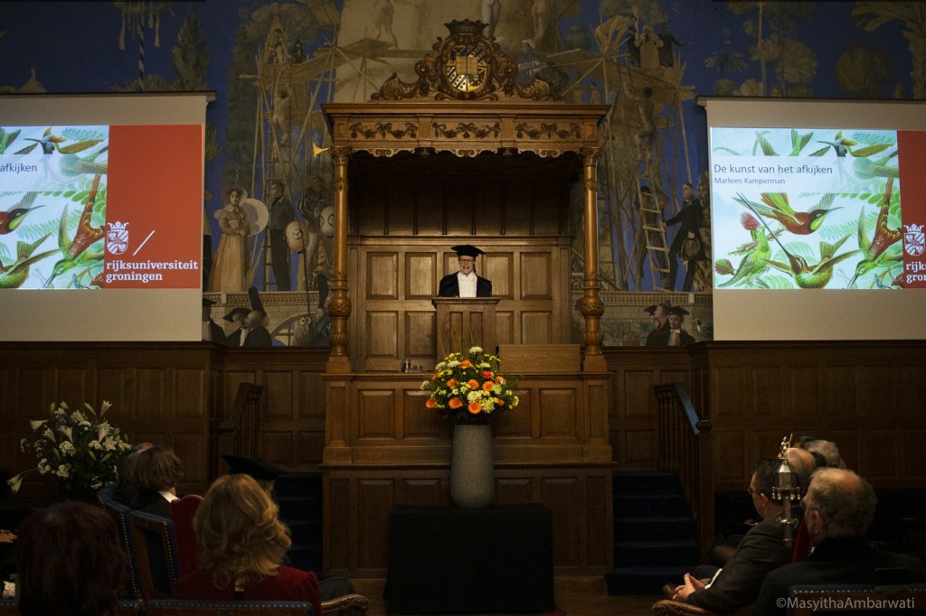 Our professor, Marleen Kamperman started last year working at the University of Groningen as full professor. During the official ceremony, she gave an inaugural lecture. The lecture was called “De kunst van het afkijken”. The ceremony was very beautiful and the room was completely filled with friends, family and colleagues. To continue the celebration, our polymer chemistry department was invited to a delicious dinner in Huize Maas.
