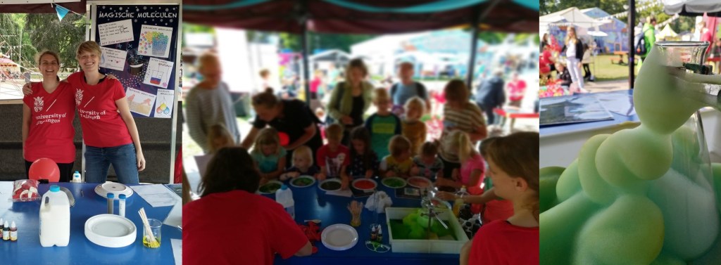 Every summer, the Noorderzon Performing Arts Festival returns to Groningen, including ‘Northern Lights: The University of Groningen’. This year, Young Academy Groningen (YAG) invited us, the Kamperman group, to introduce kids to chemistry. Via the concept ‘learn by doing’, the young scientists could try out all kinds of experiments in our Magical Molecules booth. They helped us solve the mystery on how to easily separate salt from pepper, made beautiful artworks in milk and got their hands dirty by playing with cornstarch in water. Every 20 minutes, a colourful demonstration showed the rapid decomposition of hydrogen peroxide into water, better known as foamy elephant toothpaste.