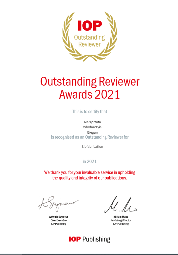 Gosia was recognized as an ‘Outstanding Reviewer‘ for Biofabrication in 2021 by IOP Publishing.