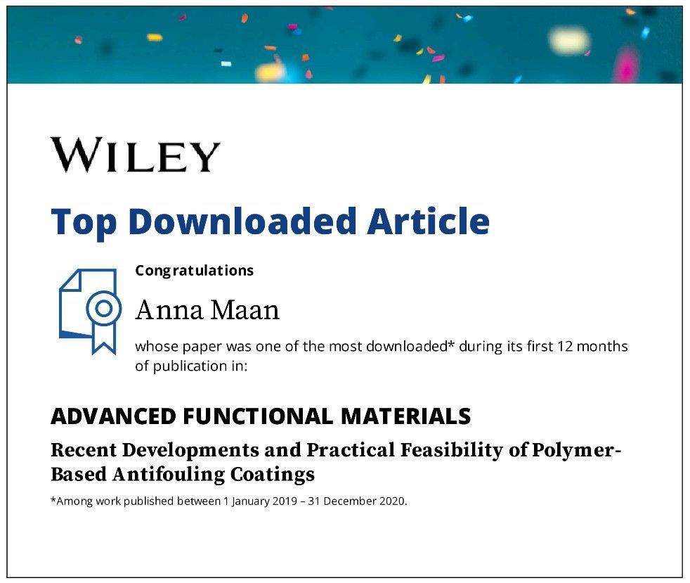 The review paper by Annemarie, Anton, and Marleen, together with Wiebe de Vos, published in Advanced Functional Materials titled ‘Recent Developments and Practical Feasibility of Polymer-Based Antifouling Coatings’ made it to the top 10 of most downloaded articles. Check it out here: https://onlinelibrary.wiley.com/doi/full/10.1002/adfm.202000936