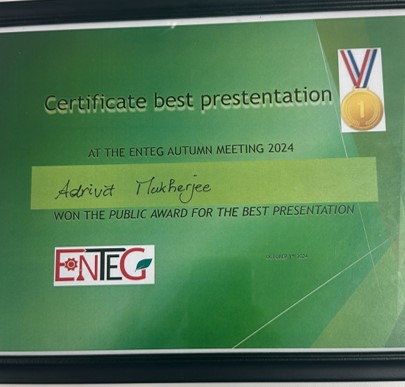 Adrivit won her best presentation award at ENTEG day 2024 for her talk on soft electrically conductive hydrogels for bioelectronic interfacing.